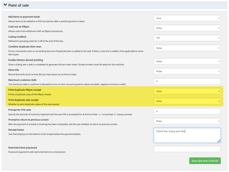 - Under the Point of sale section, you will find the Print duplicate Sale/Eftpos receipt settings.