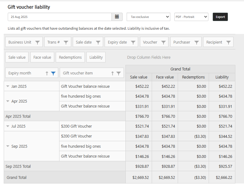 This report shows you the current value of your gift vouchers with a balance at a specific period in time. The values in this report are based on the face value of the gift voucher - not the sale value in the situation where you may have applied a discount to a gift voucher purchase at Point of Sale. It also includes remaining balances for partially redeemed gift vouchers.